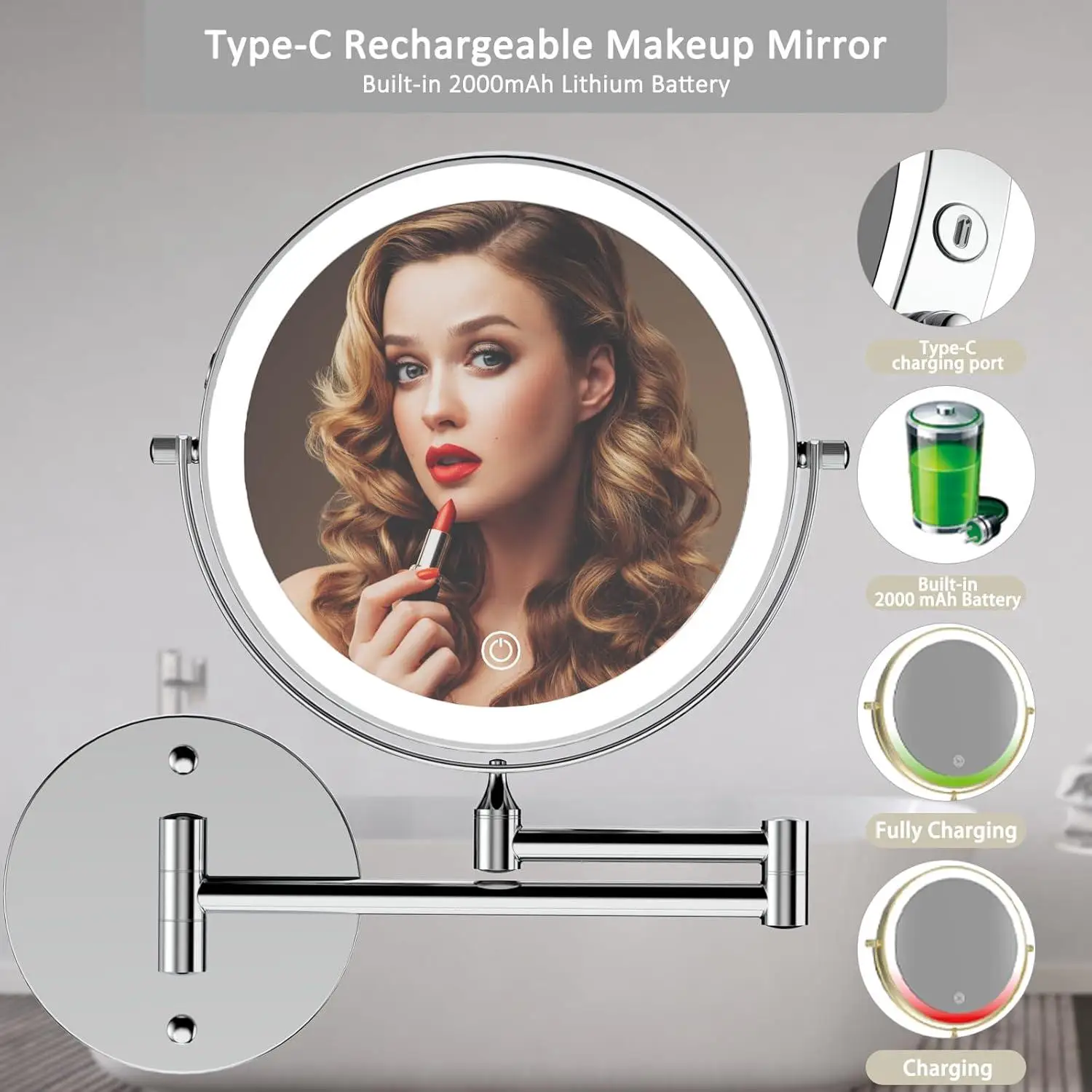 ● 【Rechargeable LED Wall Mirror】This upgraded wall mounted makeup mirror built-in 2000mAh rechargeable Lithium battery, Type-C cable is included. No placing batteries needed. This lighted makeup mirror is USB rechargeable.