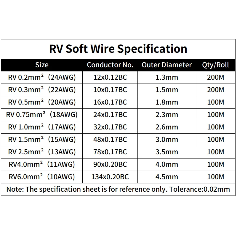 10AWG (6.0mm2)11AWG (4.0mm2)13AWG (2.5mm2)15AWG (1.5mm2)17AWG (1.0mm2)18AWG (0.75mm2)20AWG (0.5mm2)22AWG (0.3mm2)24AWG (0.2mm2)