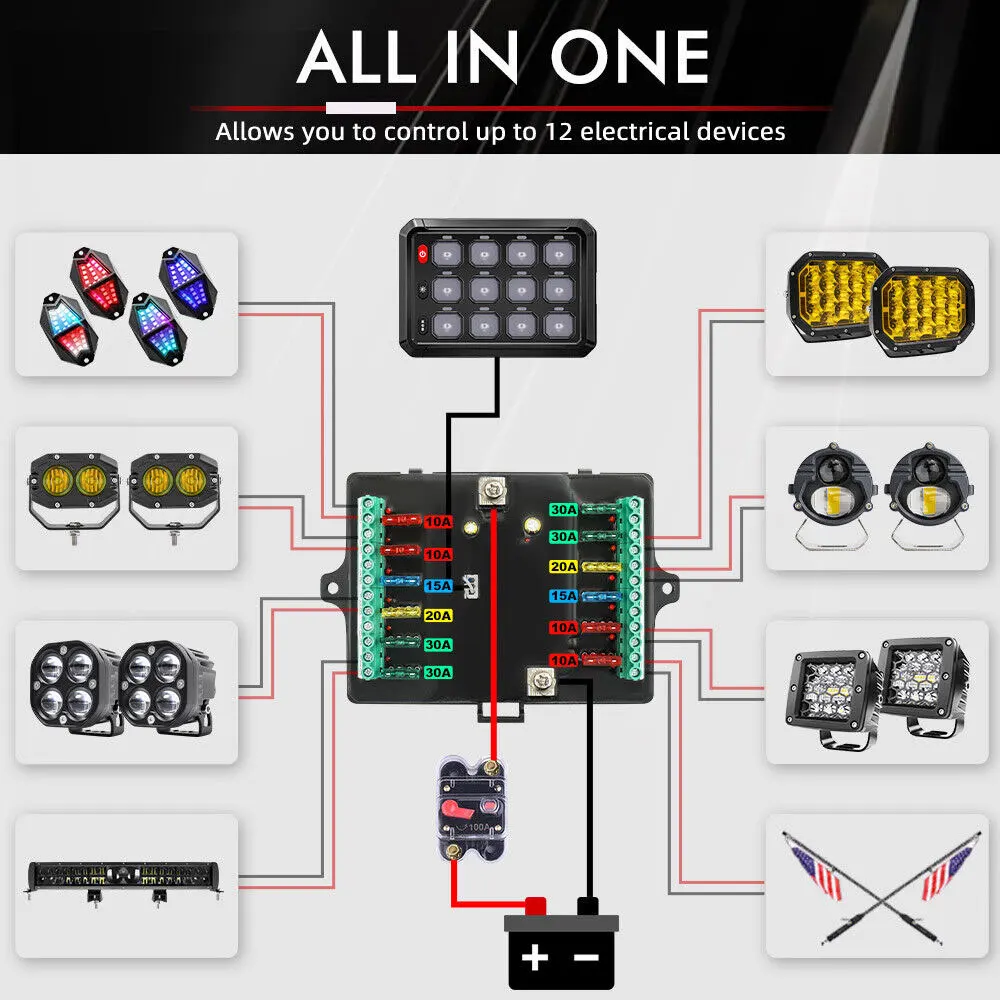This universal switch panel is made with a rugged brushed aluminum body. With a large current and greater stability, the new switch panel increased by 20% more than the 8gang in size, which is safer&easier to use. The update on the circuit design allows you to connect Four 30A circuits, two 20A circuits, two 15A circuits and four 10A circuitsfor different lighting applications. In another word, you can control up to 12 lighting devices, such as LED light bars, round driving lights, rock lights, whips lights, horns, etc. When the lighting system exceeds themaximum 80A current, the circuit breaker will automatically stop the current flow to avoid failure. Come with two different mounting brackets and necessary hardware, this smartest switch panel is prepared for any future adventures.