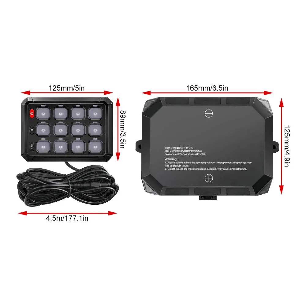 With a large 5” L x 3.5” W x 0.5” H design, this 12 Switch Panel operates at 12V / 24V DC and comes with a full accessory kit for complete installation. The 12 Buttons can be visually customized with 50 self-adhesive labels. Except for the 12 buttons on the switch panel, it has3 Silicone Buttonson the left. They are the on/off switch Button, Brightness Adjustment Button, and RGB Color Adjustment Button. With thememory function, turn on the off switch to get the last light mode. Long press to the “RGB” keycan also realize the switching of the Gradient/Jump/Breathing function. Short press the “RGB” key to switch between 8 single colors: red, orange, yellow, green, blue, purple, and white. Also, there are also 5-level brightness adjustmentsof 100%, 75%, 50%, 25%, and 10%, providing you with the most comfortable visual brightness when driving.